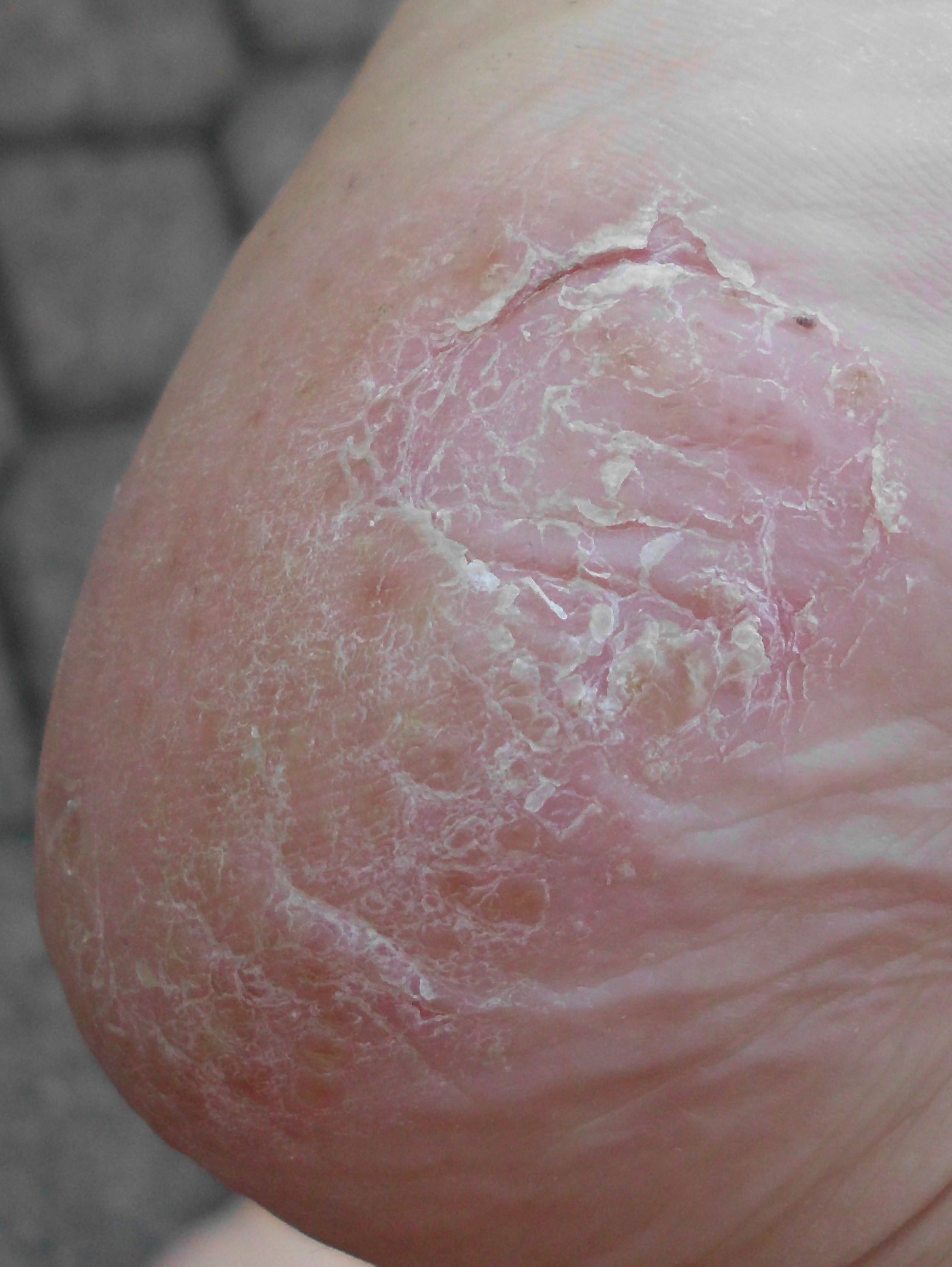 Die Haut an der Stelle ist sehr verhornt aber dennoch sehr dünn und äußerst empfindlich. Es ist eine dünne Hautschicht mit etwas Hornhaut darauf, welche sich nach der juckenden Bläschenbildung ablöst und anschließend die dünne Hautschicht preisgibt, oft blutet es zudem noch.