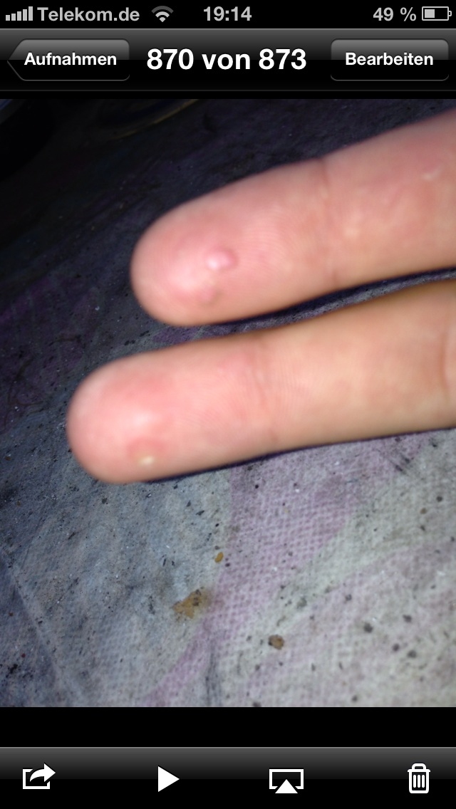 Haut löst sich immer wieder, wenn sie grad wieder nachgebildet ist von den Fingern bis zur untersten Hautschicht. Wo sich die Haut löst wird sie taub. Schmerzen sind keine vorhanden. Erst war es nur bei einem Finger nun sind alle betroffen seit ca einem Jahr