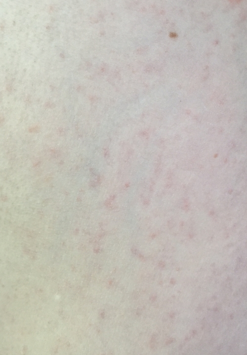 Die weiteren Symptome am Freitag Abend, Samstag und vor allem Sonntag (ganztags) starke Kopfschmerzen, Gliederschmerzen, leichtes Fieber (nicht gemessen, nur Stirn gefühlt durch meine Frau). Bin die letzten drei Nächte früh ins Bett, warm eingepackt, um zu schwitzen (was bei den aktuellen Temperaturen ja kein Problem ist g). Heute (Montag) sind die Kopfschmerzen viel besser, die Gliederschmerzen sind fast weg, der Ausschlag ist noch leicht sichtbar, aber viel besser als am Fr/Sa.