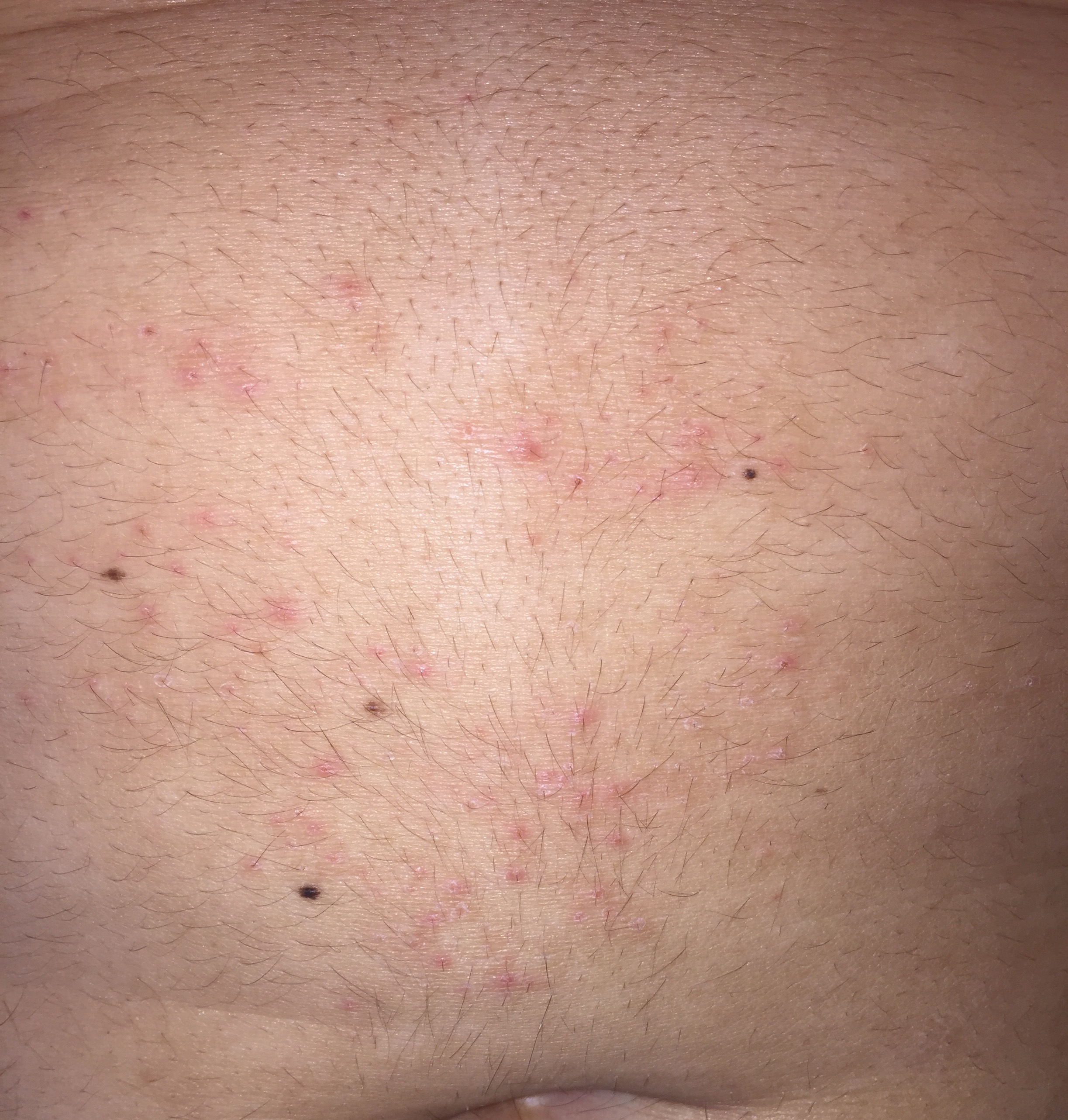 Am Bauch, unterhalb der Brust und vor allem auf den Schulterblättern bilden sich, am stärksten nach dem Duschen, rote Punkte und Flecken.