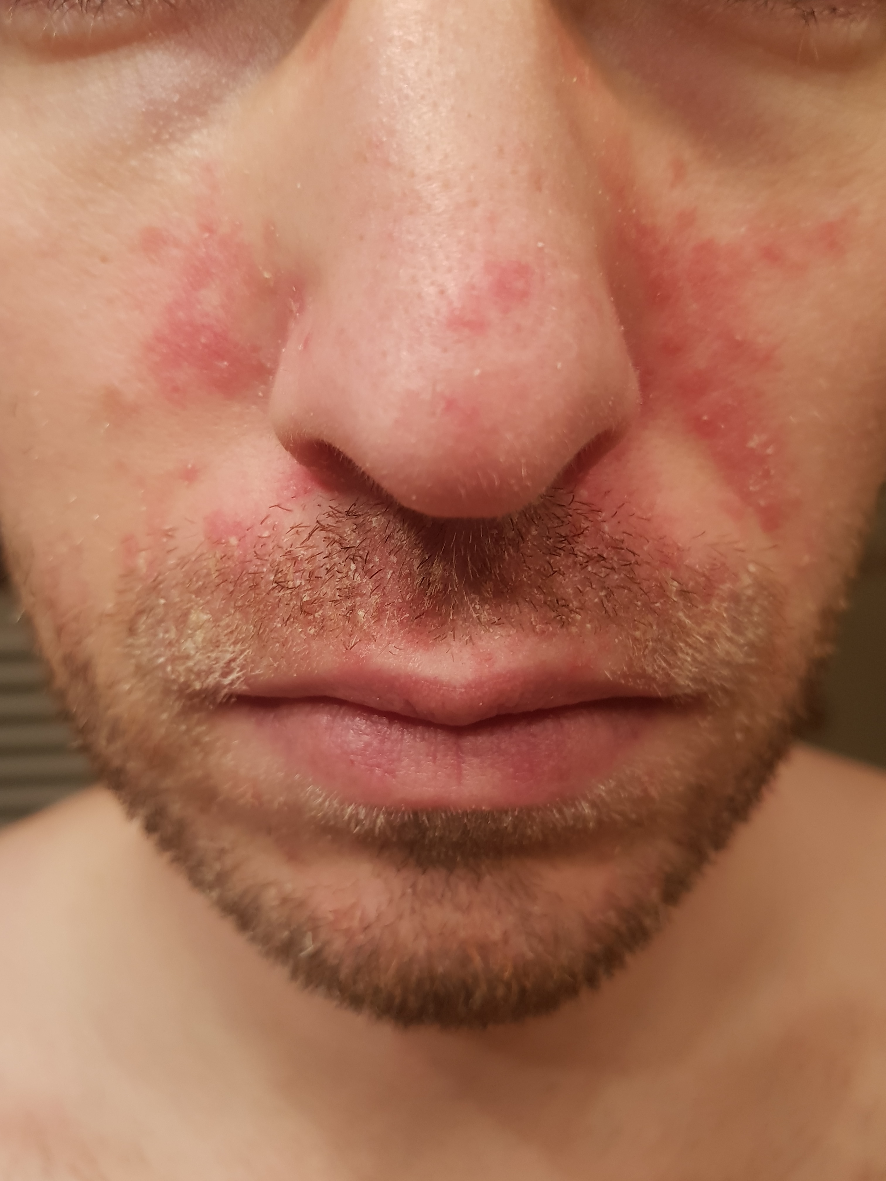 Doch nun zu meinem eigentlichen ziemlich akuten Problem, siehe Anhang. Seit bestimmt 3 Monaten laufe ich derart rum und es ist einfach kein Zustand. Begonnen hat alles mit Rötungen am Mund, dann zwischen Wange und Nase, Wangen, dann an der Nase und an Stirn, Augenbrauen und Augenliedern. Also eigentlich überall. Mein Arzt sagte es sei ein seborrhoisches Ekzem und gab mir Salben, die aber nicht halfen. Ich probierte es mit Honig, verschiedensten Cremen, CBD-Cremen und leichter Fruchtsäure, wobei die ab und an mal leicht linderte. Die Schuppen am Haaransatz habe ich mit einem SE Shampoo von Ducray im Griff, alles andere aber nicht.