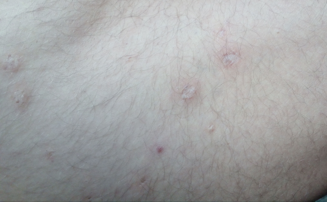 Hey ,ich hab seit 2 Jahren ca runde Kreise an den Oberschenkel und zwischen den Leistendie mit mitesser gefüllt sind weiß einer was das ist ,danke