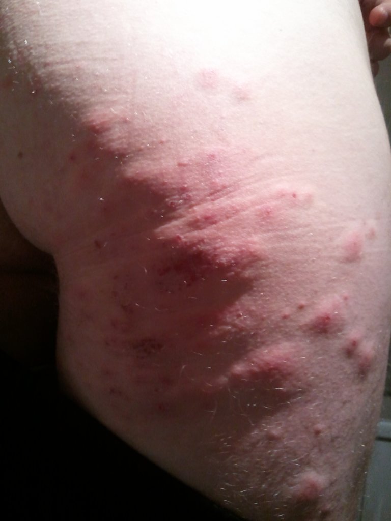 Ich habe seit ca 1 1/2 Wochen das problem das ich an meiner rechten Pobacke runter bis zum Oberschenkel einen sehr komischen ausschlag habe, der seeeeehr Juckt, ich kann mich kaum zusammen reissen nicht zu kratzen Sad