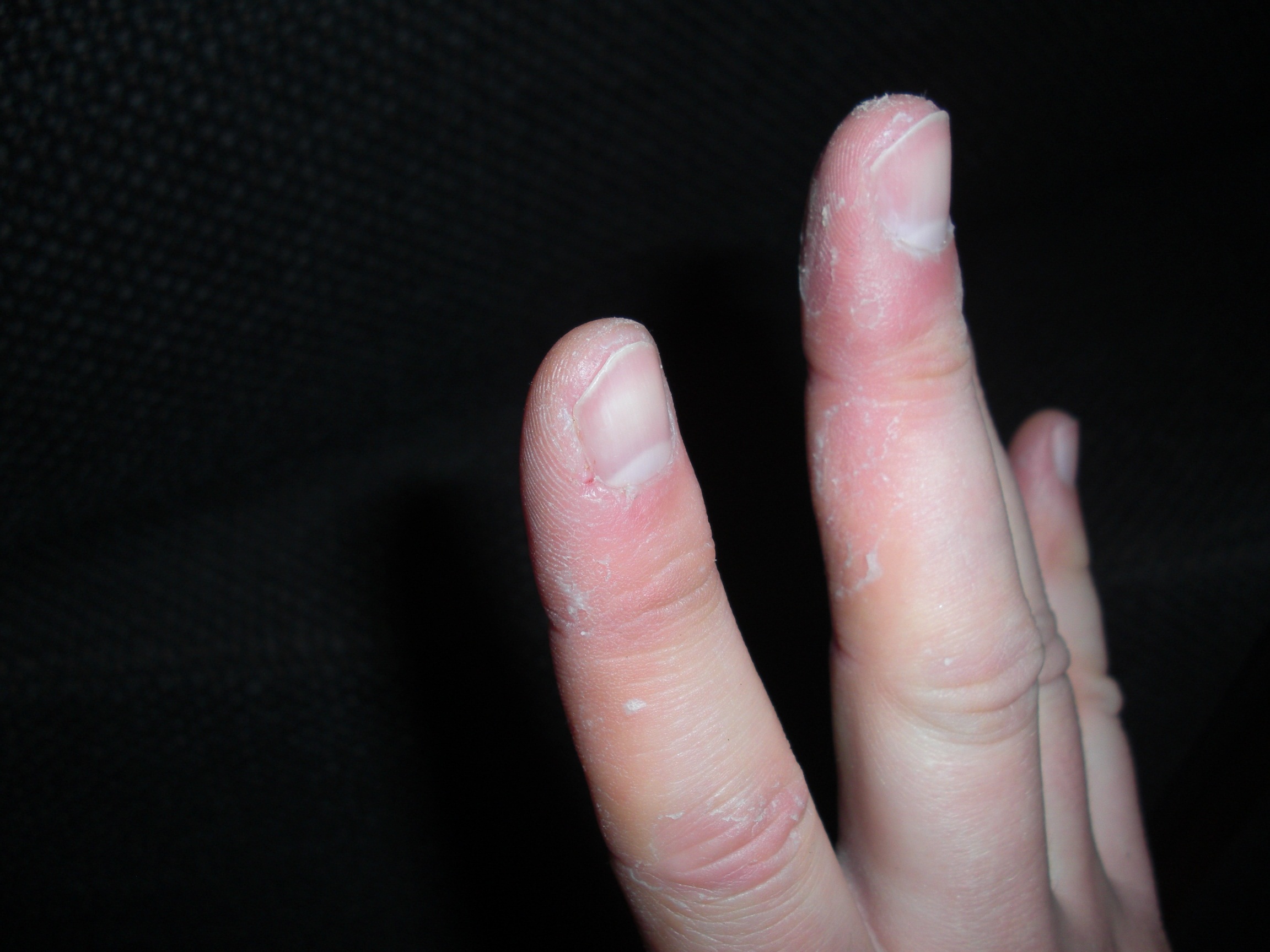 ich habe seit ein paar Tagen wieder Probleme mit der Haut an meinen Fingern. Diese löst sich großflächig ab (an den Fingerkuppen hauptsächlich aber auch an der Seite und an den Knöcheln oben).