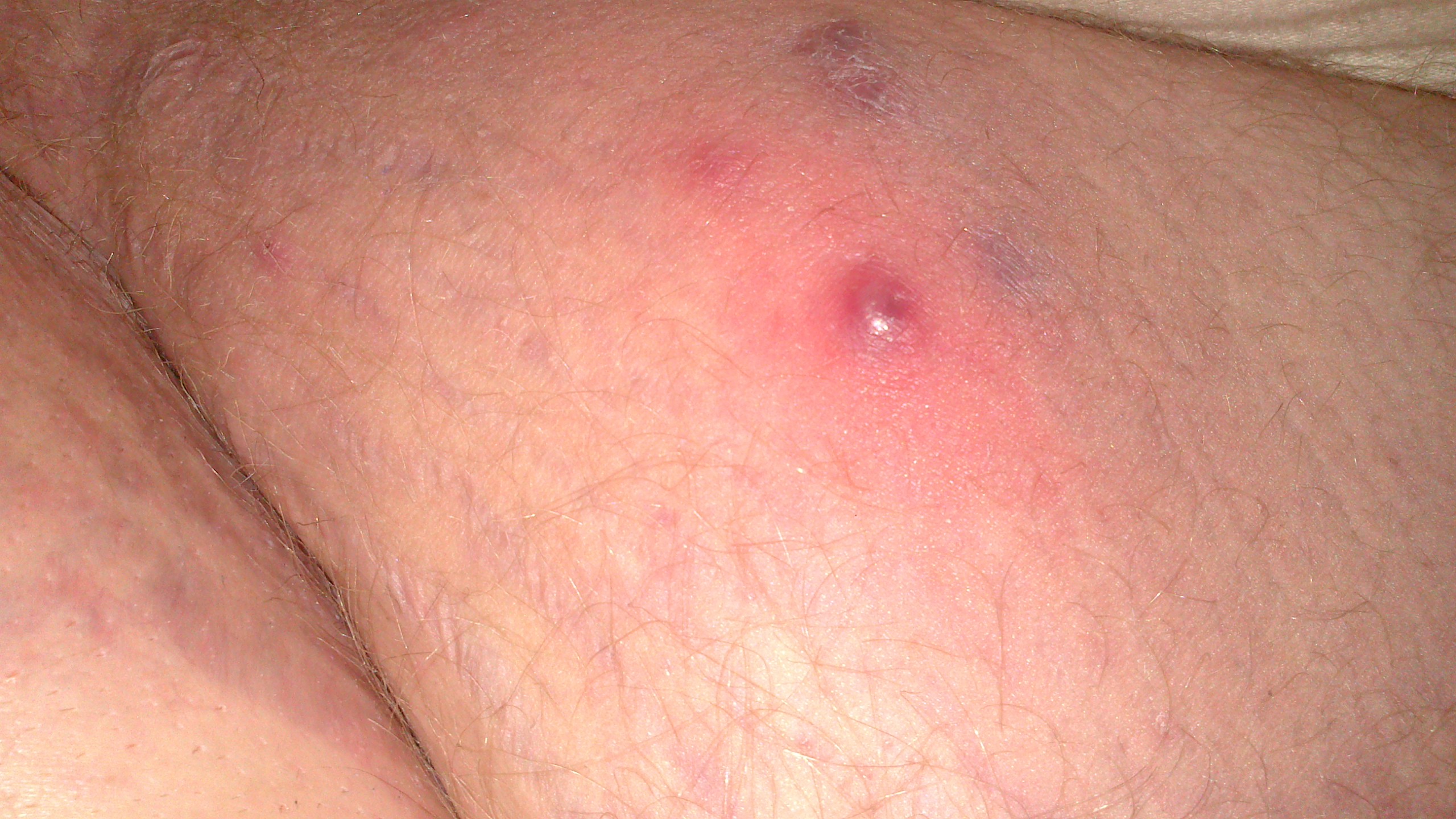 so auf die schnelle weiß ich auch nicht was das sein kann. Aber große Sorgen würd ich mir erstmal nicht machen. Kannst ja mal abwarten wie sich das entwickelt. Wenn du nicht an ihnen rummachst, tun sie dann weh? Falls es mit der Zeit nicht besser wird und du dir wirklich Sorgen machen solltest kannst du ja auch einfach mal einen Termin beim Dermatologen machen.Was mir gerade noch einfällt: Ich hab auf einer Hauttipps Seite mal ein wenig gestöbert. Da steht auch, dass Hautirritationen durch Allergien und natürlich Giftstoffe hervorgerufen werden können. Hast du vllt eine neue Hose, die du vor dem Anziehen nicht gewaschen hast?