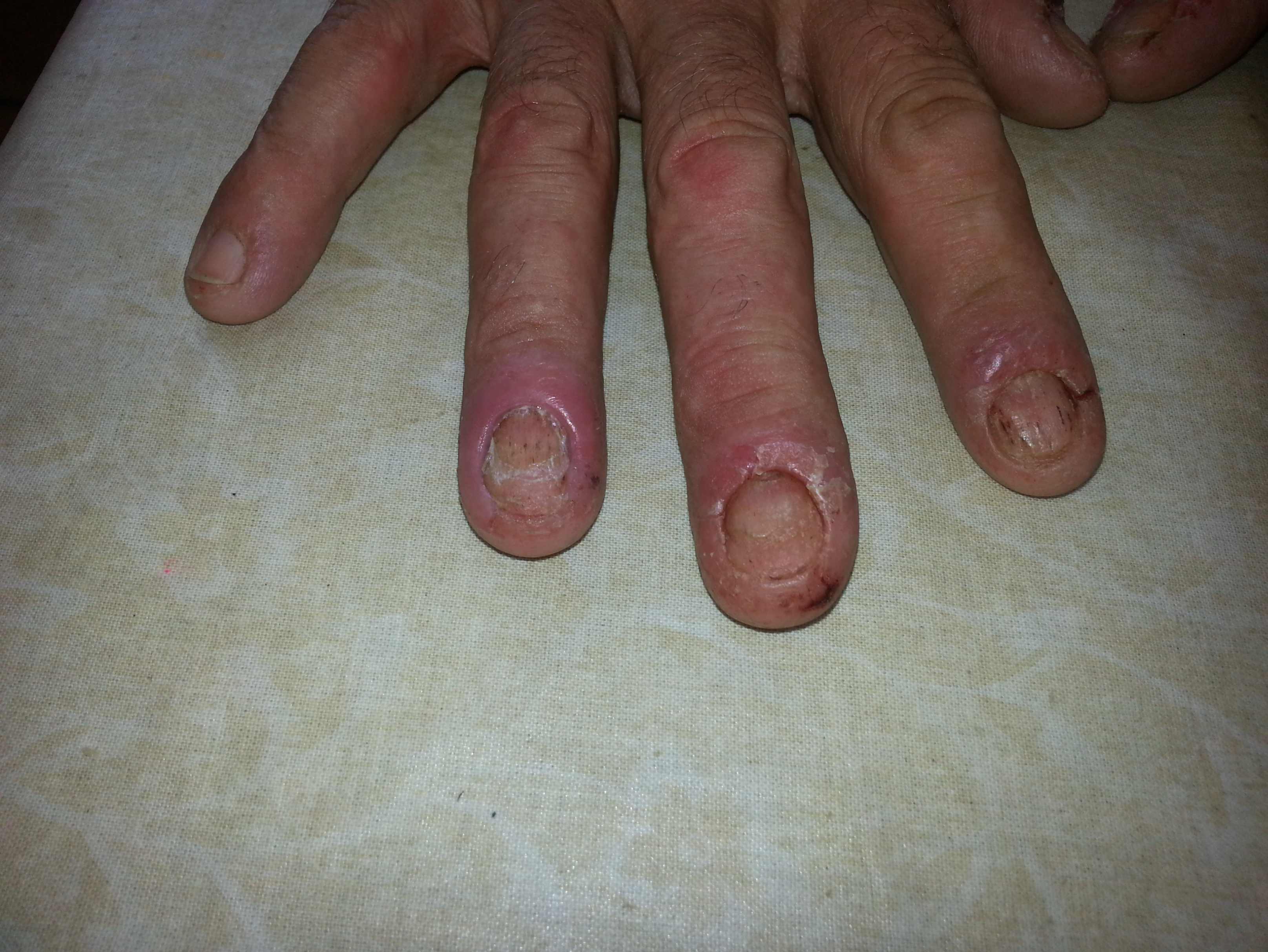 mein Nachbar ohne Netzzugang quält schon einige Jahre die Tatsache, daß immer wieder an den Fingern und Zehen die Haut abgeht. Er ist in Behandlung und war bei verschiedenen Kliniken, bislang konnte man aber nicht herausfinden, um was es sich dabei handelt. Cortisonsalbe hilft einigermaßen, ist aber keine Dauerlösung. Anbei ein Bild. Vielleicht hat da jemand einen Tip, um was es sich da handelt?