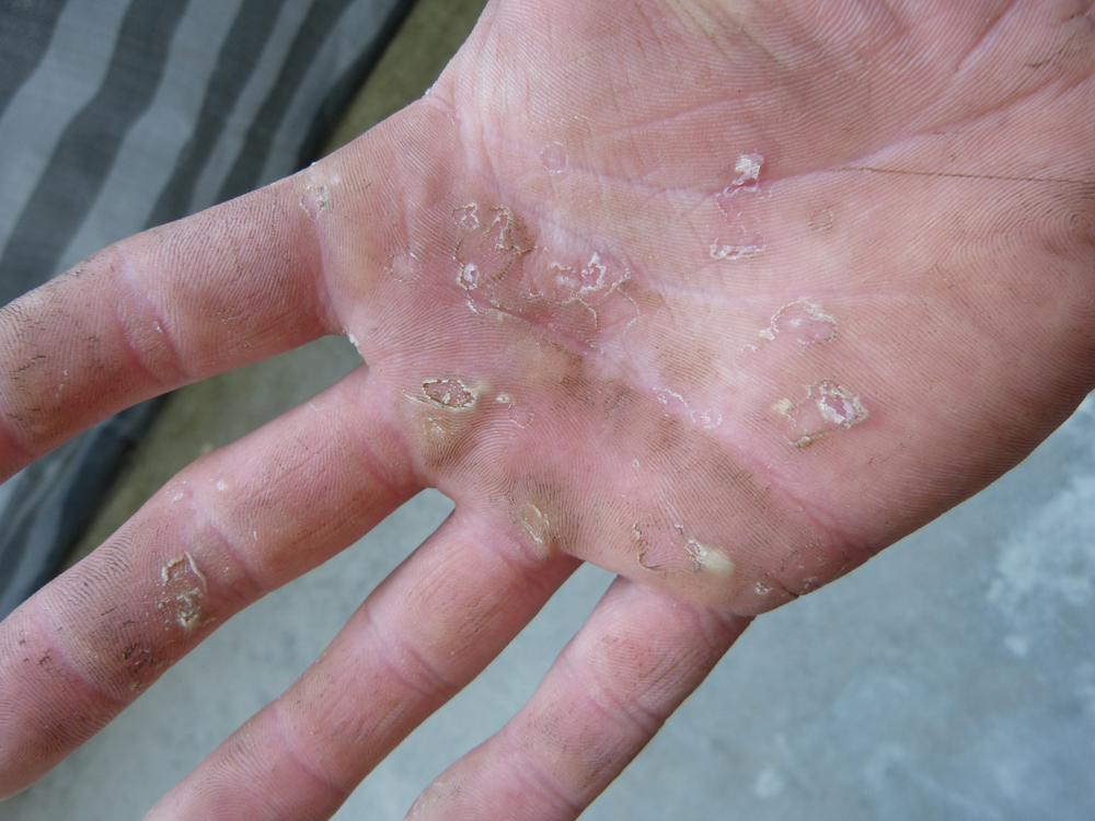 Zuerst bilden sich Verhärtungen an der Hand die dann allmählich weiss werden und aufplatzen danach löst sich die Haut rundherum immer weiter ab