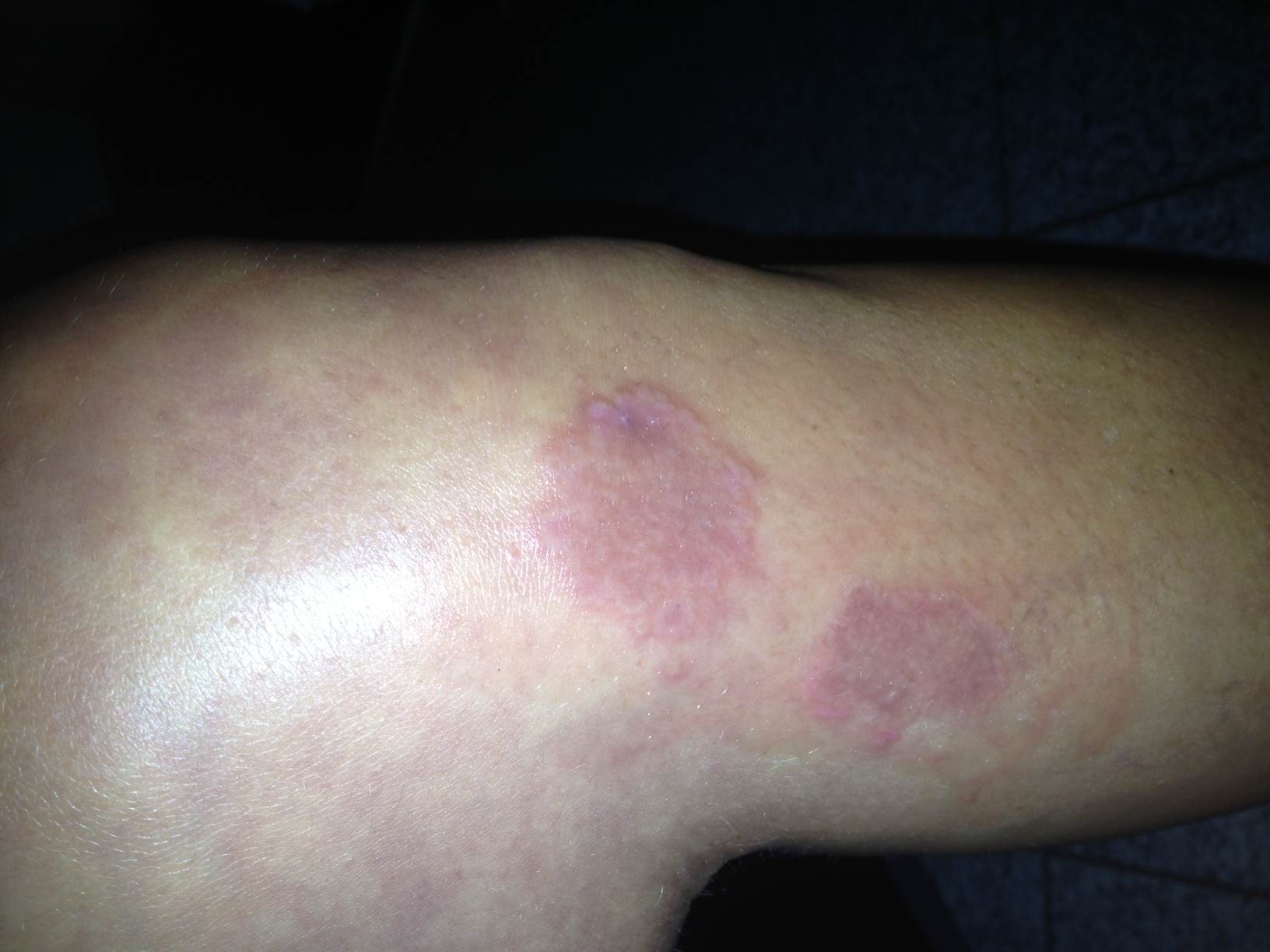 Ich bin 42 Jahre alt und haben noch nie probleme mit der Haut gehabt.es fing an ,mit einem 2cent stück grossen fleck am bein.mittlerweile sind es ungefähr 16 2euro stück grosse rote flecken die von beiden beinen bis hin zum bauch wandern.