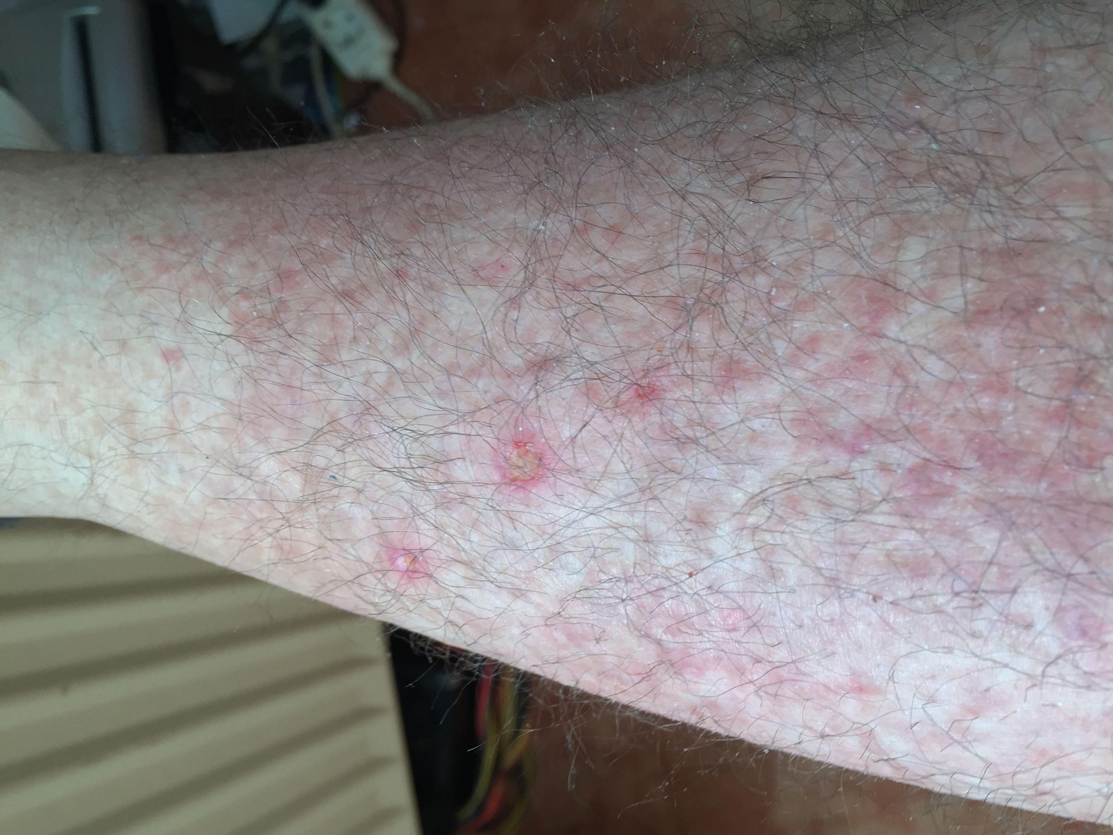 Daraufhin hat sich eine Wundrose gebildet. Diese wurde mit einem Antibiotikum behandelt, und ist verschwunden. Nun nach einer Woche kam die Wundrose? zurück. Komischerweise waren auf einem beide Unterschenkel voll mit kleinen roten Pünktchen. Also zum Hautarzt. Dieser hat eine Salbe anmischen lassen, und ich sollte die Beine damit ordentlich einreiben. Nachdem ich die Salbe benutzt habe wurde es nur noch schlimmer mit dem Ausschlag. Darauf hin wurde mir eine Gewebeprobe entnommen. Verdacht auf: Vasculitis. Die Ergebnis was Negativ. Hautarzt war Ratlos was es ist. Also bin zum Hausarzt gegangen. Der meinte das ist Wundrose. 14 Tage Penecillin 1.5 Mega + Prednisolon 100mg 2Tage, 50mg 2 Tage usw halt runter dosieren. Juuhu es war alles wech kein Ausschlag mehr, kein Juckreiz nix mehr da . 2.5 Wochen später Nachts aufgewacht extrem Schüttelfrost, aber kein Fieber und wieder extremer Juckreiz an beiden Unterschenkeln. Vorstellung Hautklinik. Verdacht auf Urticaria DD Urticariavaskulitis. Sehr sehr viele spezielle Blutproben wurden gemacht. Therapie. 4x Urtimed Tabletten am Tag, 7.5mg Prednisolon und Optiderm Salbe. Blutbild war alles Negativ Soll zum Hautarzt mich weiter behandeln lassen. Termin beim Hautarzt dieser meinte das wäre Krätze. Aber nur an den Unterschenkeln? Therapie. 6x 1Tag. Scabioral Tabletten + Fusicutan plus Betamethason Salbe . Zustand jetzt. Durch die Salbe beide Unterschenkel voll mir juckenden Ausschlag.